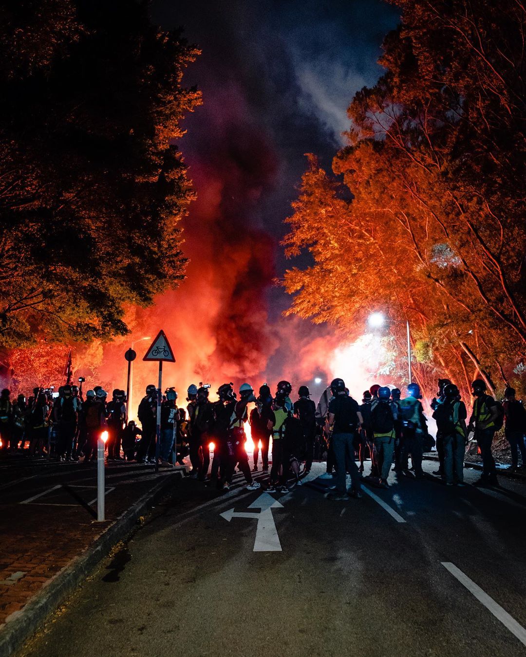 警察與學生對峙於二號橋上,彈火燃燒形成的熊熊火光與煙霧染紅香港中文大學夜景。 圖/艾克(化名)提供