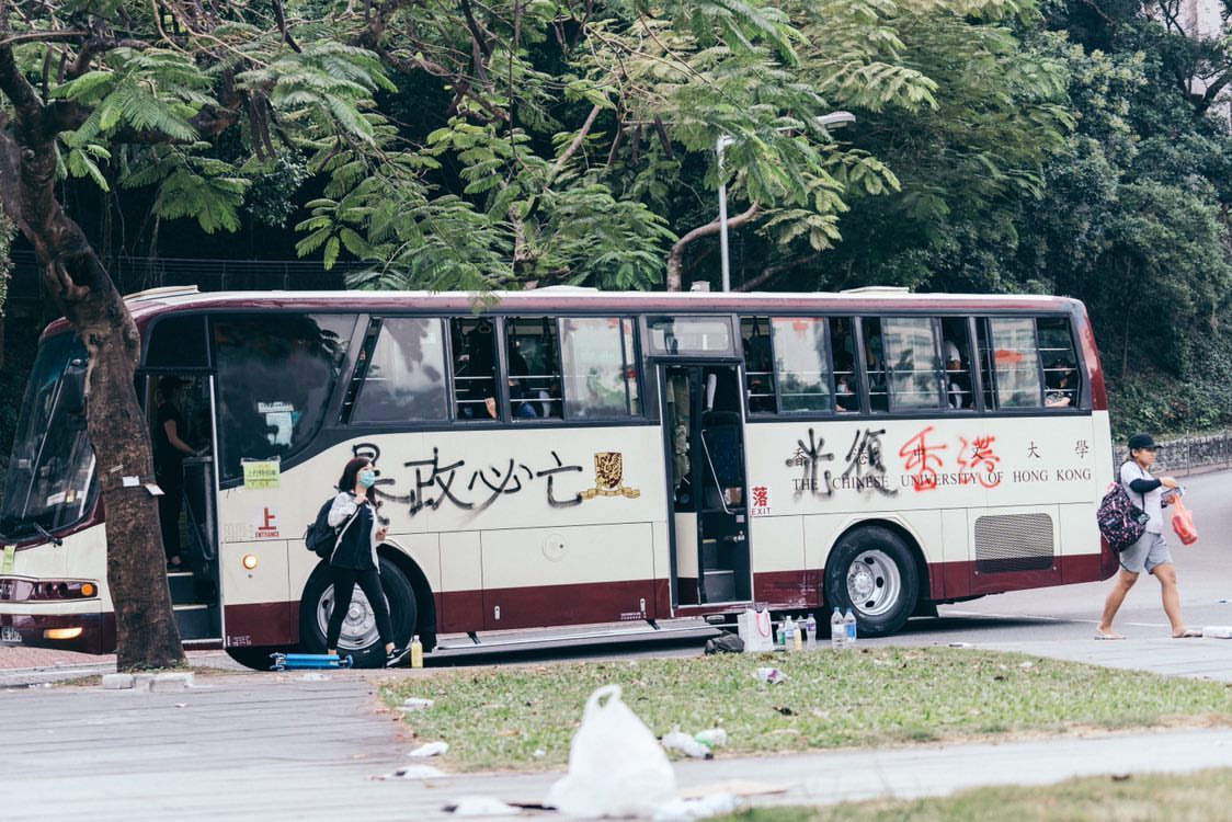 香港中文大學唯一一台尚在運作的校巴被噴上塗鴉大字「暴政必亡,光復香港」,學生大搖大擺地於校內練習駕駛它,無人覺得突兀。 圖/區欠(化名)提供
