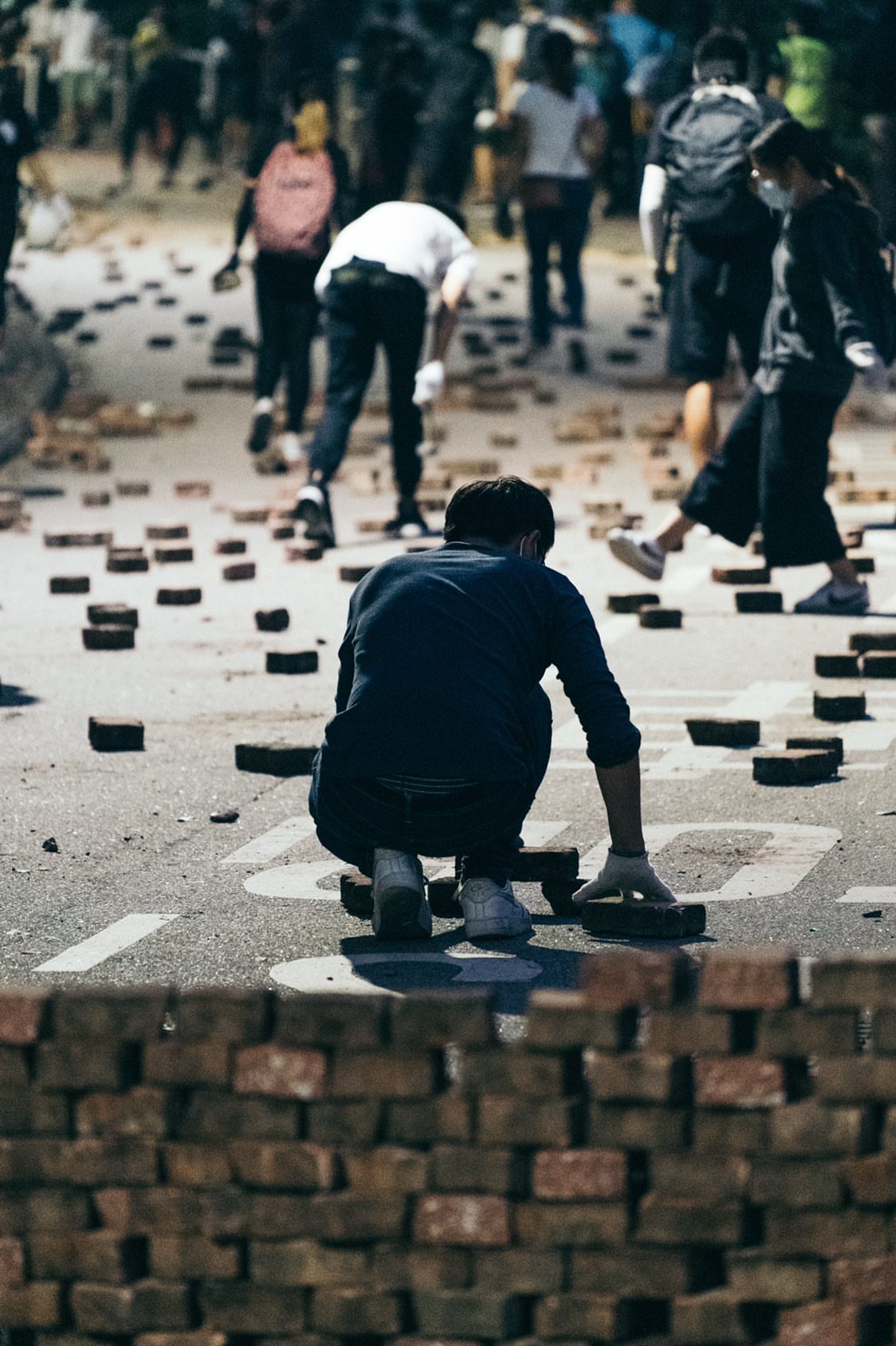 學生在香港中文大學崇基門附近用磚塊布置路障並築起城牆,自力救濟以防止警察再度入校。 圖/區欠(化名)提供