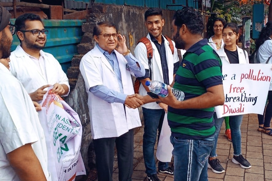 排燈節每年在印度曆8月的滿月時舉行,是印度教最重要的傳統節日之一,民眾為慶祝節日大量施放鞭炮,造成嚴重的空氣及噪音汙染。「我們作為未來的醫生,有責任告訴人們空氣汙染會危害環境與人體健康!」印度醫學協會學生組織(Indian Medical Association-Medical Students’ Network, IMA MSN)學生會長德維.每塔(Dwij Y Mehta)憂心地說。10月25日,以印度醫學協會學生組織為首的數個團隊在孟買街頭集結,成員們身穿白袍、頭戴聽診器並高舉「慶祝綠色排燈節(GREEN DIWALI CELEBRATION)」的布條,一起向來往群眾及遊客互動並宣導理念。每塔表示,節慶過後空氣品質下降,導致心肺疾病患者求診比例大幅攀升,他們希望群眾能意識到燃放鞭炮的嚴重性。