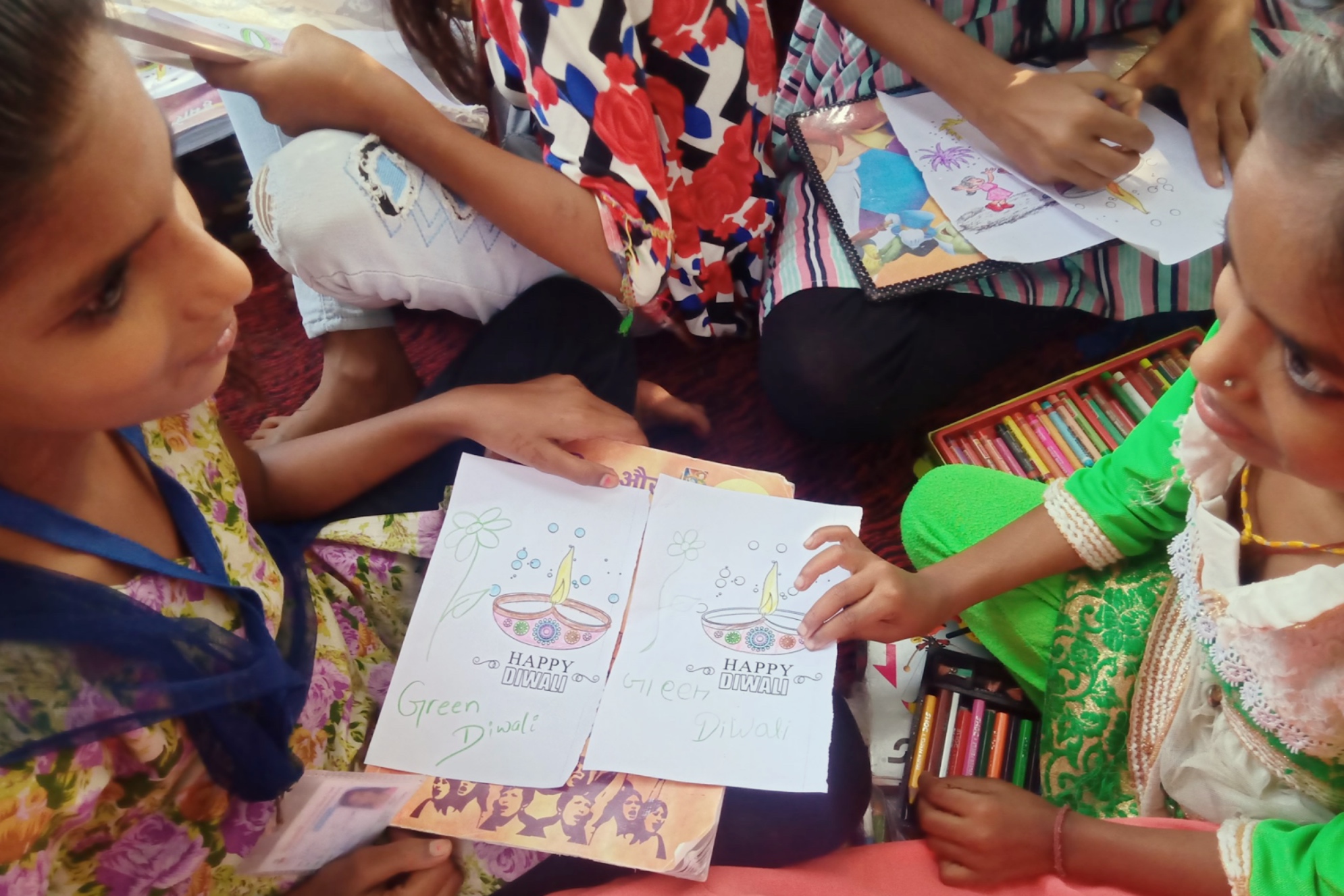 古爾岡友好大學學生用繪畫讓孩童認識綠色排燈節,期待能讓環保觀念在孩子心中萌芽。 圖/薩拉結基金會提供