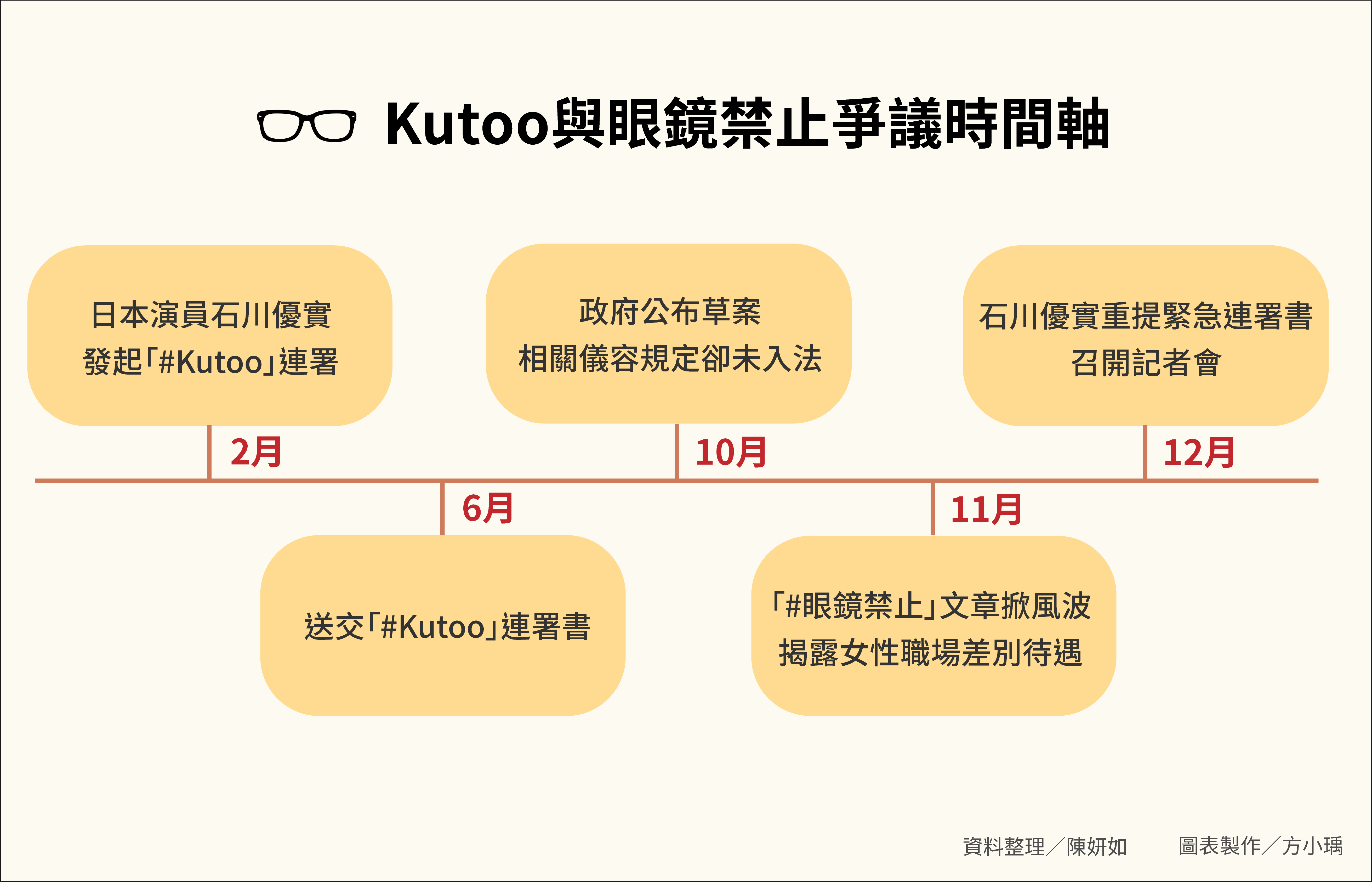 「Kutoo」運動持續延燒的同時,企業「禁止女性戴眼鏡」的規定也造成軒然大波。不少女性質疑,為何企業以「觀感不佳」為由規定女員工不可配戴玻璃眼鏡,然而同樣的限制卻不適用於男性?兵庫教育大學學生寺西圓提到,自己曾被要求出席學校正式場合時應戴隱形眼鏡,「我覺得不應該以外在打扮來認定一個人的形象,這對我而言很不方便。」來自台灣的筑波大學交換學生劉怡萱則表示,日本社會對女生的打扮存在許多台灣人難以想像的潛規則,「她們穿高跟鞋、戴隱形眼鏡是為了迎合社會價值觀,希望能展現出『女子力(註2)』。」為配合日本的習慣,有近視的她也在參加學校的國際學生交流會時,特地改戴隱形眼鏡,「總覺得還是要入境隨俗。」