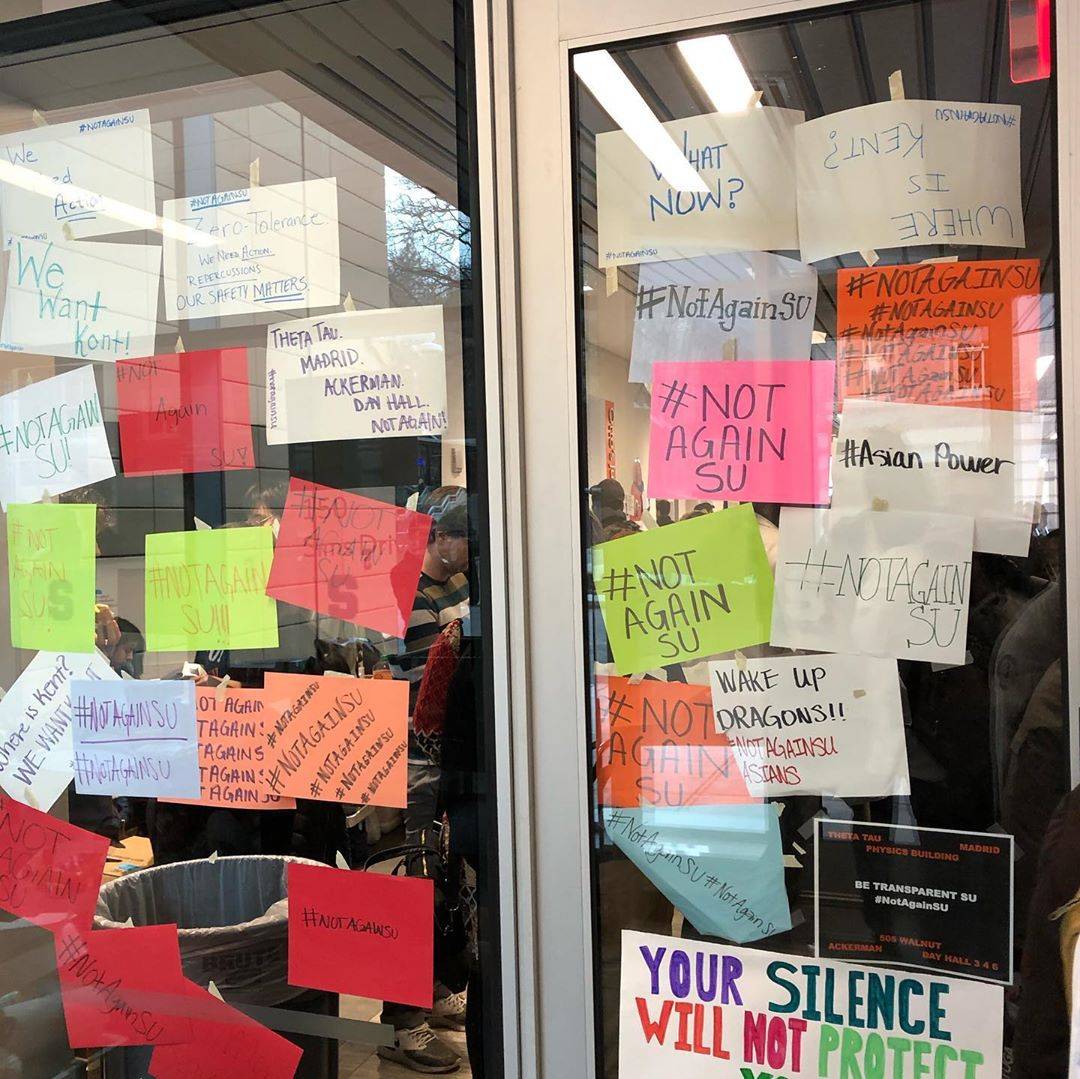 【記者陳子瑜綜合報導】自13日起,美國紐約雪城大學(Syracuse University, SU)巴恩斯健康中心(Barnes Center)的牆面貼滿「#種族事件不再發生(#NOTAGAINSU)」便利貼,數十名學生佔據健康中心通道,以徹夜靜坐、發表演說、遊行等方式,抗議校方對校內發生的種族主義事件毫無作為,任憑學生暴露在危險中。