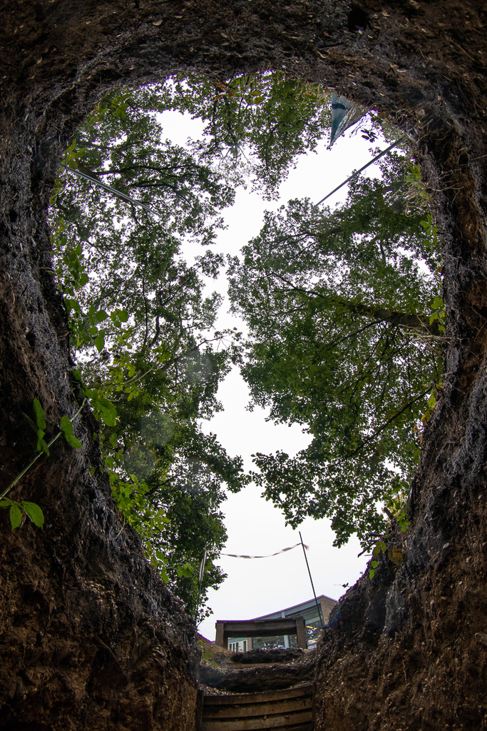 從墳墓中往正上方看墳墓外的風景,僅一片天空和少許樹枝,視線和墳墓同寬。 圖/雷因・維林加提供
