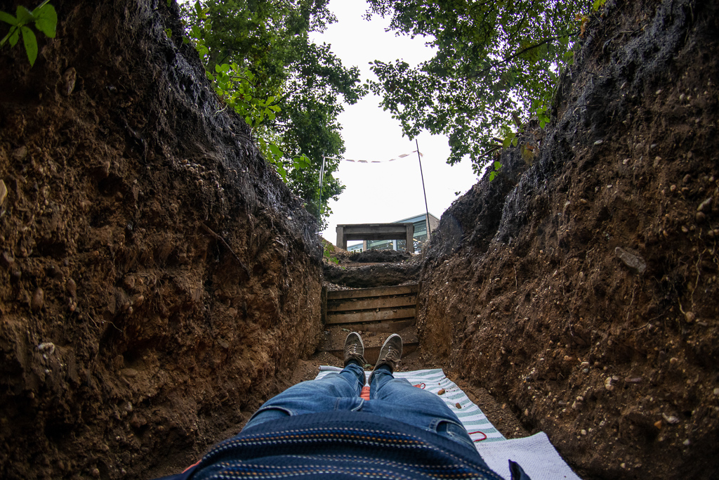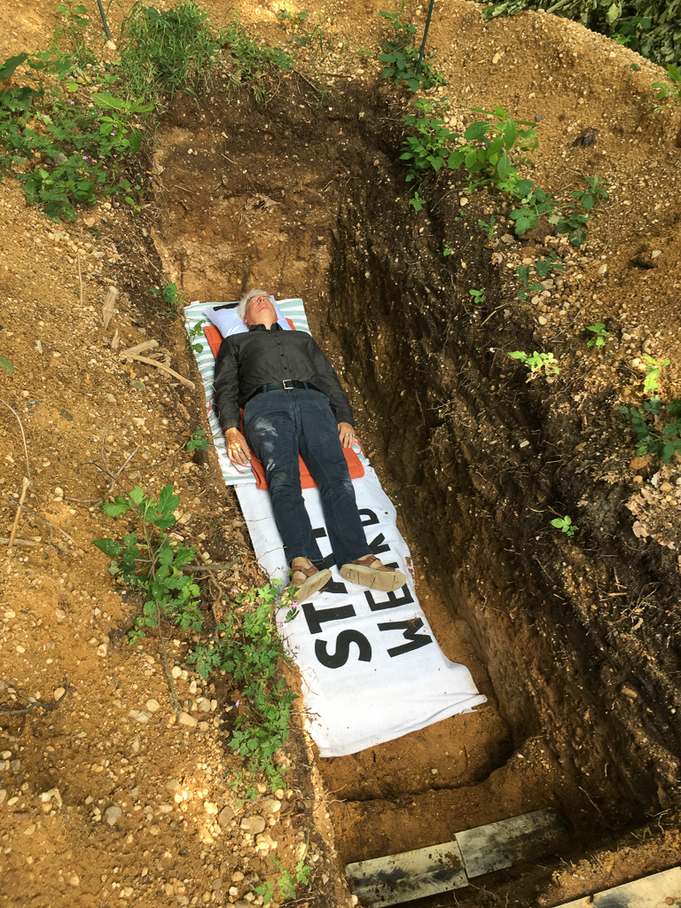 學校牧師約翰・哈金為挖鑿此墳墓的發起者,他親自躺進墳墓示範在墳墓中冥想的情境。 圖/約翰・哈金提供